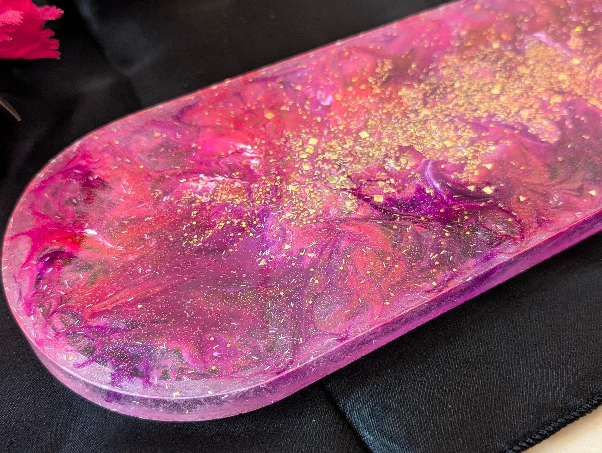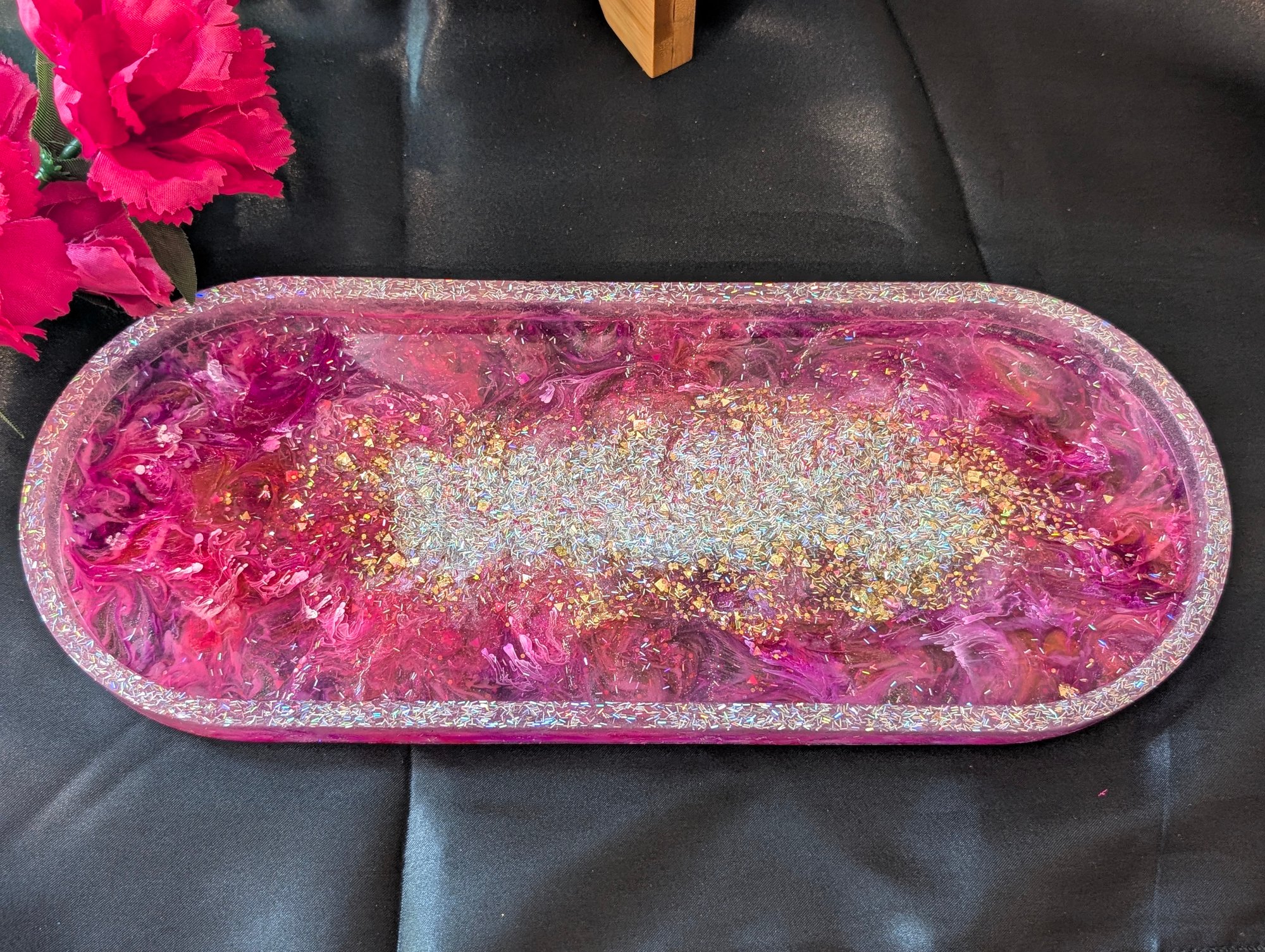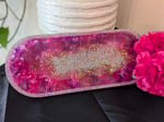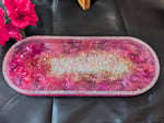 A delicately crafted pink floral accessory tray, adorned with luminous silver iridescent glitter that shimmers with every shift of light. Its graceful design offers a refined resting place for jewelry and small treasures, blending softness and sophistication in a timeless, handcrafted piece.