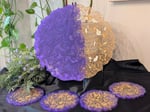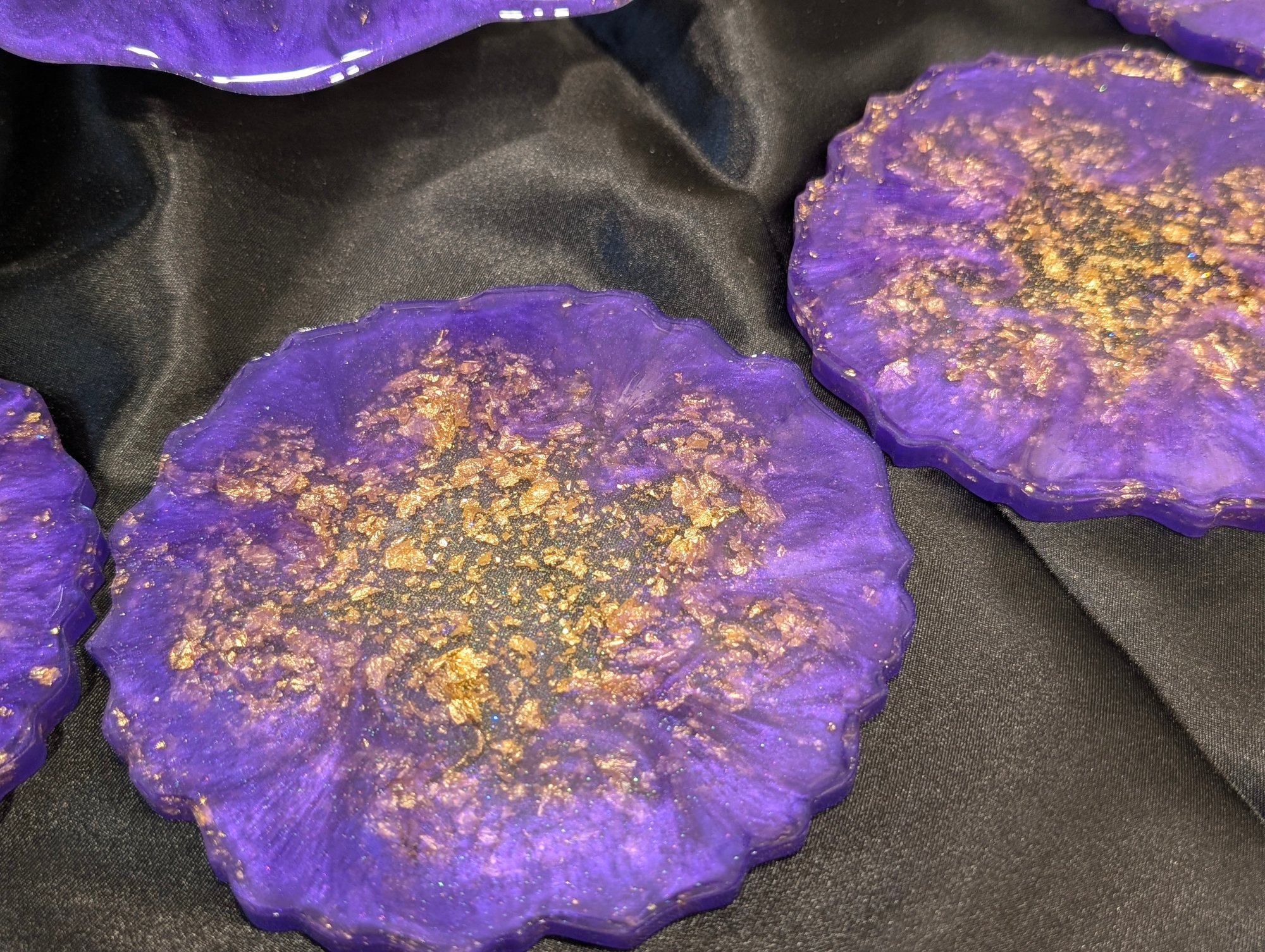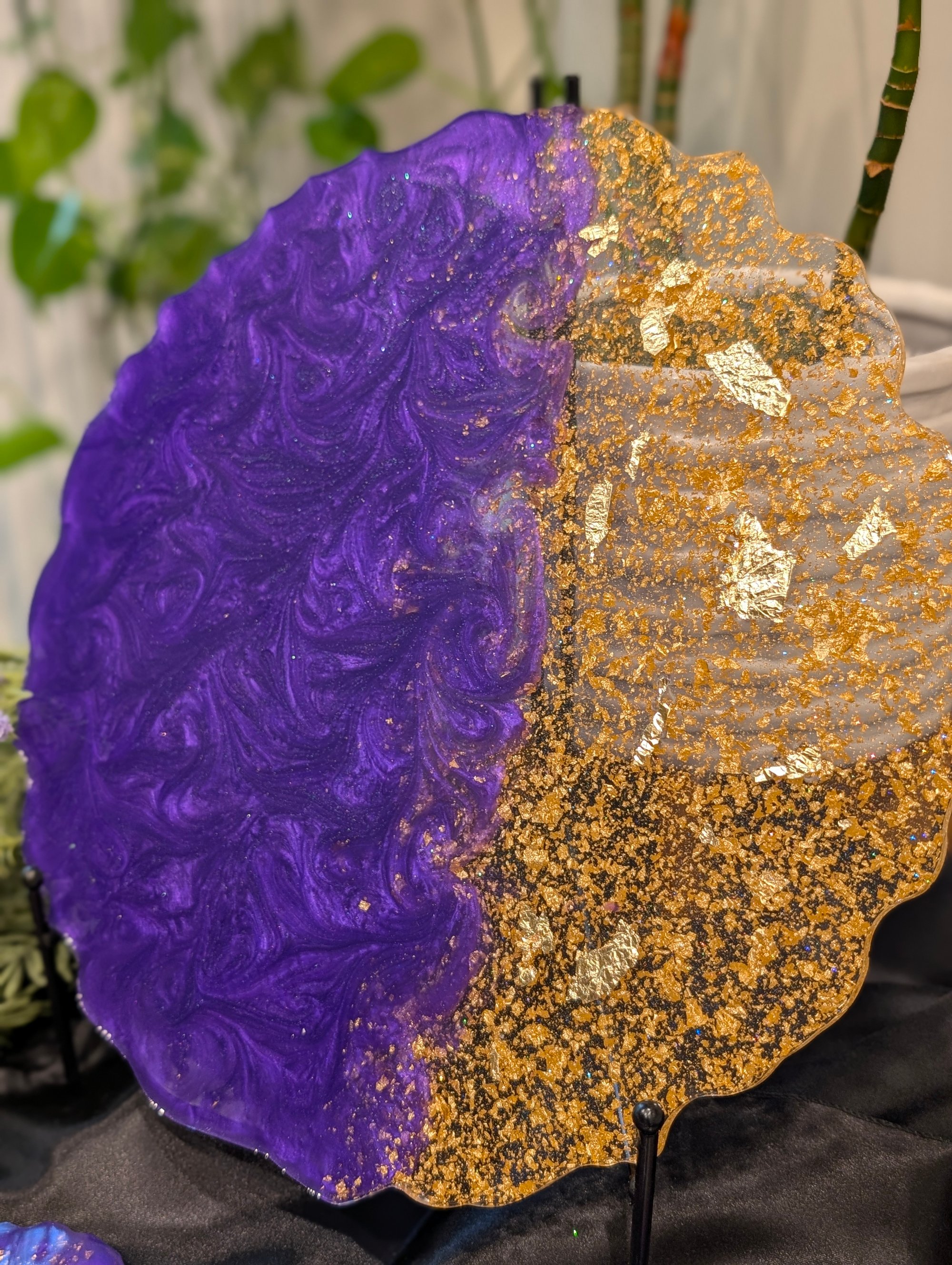 This stunning set includes a large scalloped platter and four coordinating coasters, all crafted with vibrant, swirling metallic purple resin on one side and adorned with shimmering gold leaf accents on the other.